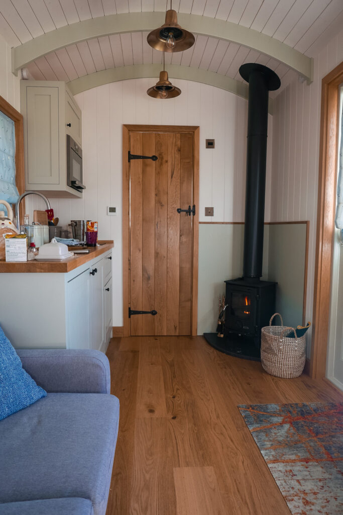 Beyond the bed-den, calming mints, blues and whites run the length of Grace. Colours that perfectly complement the real oak wood of her doors, work surfaces and floors (which are fitted with underfloor heating – toasty). The open-plan dining, cooking and living space is nicely laid out, with a cornflower blue two-seater sofa, a small dining table and chairs, and a log burner that heats up in no time (although you can flick the heating on if you’re impatient).